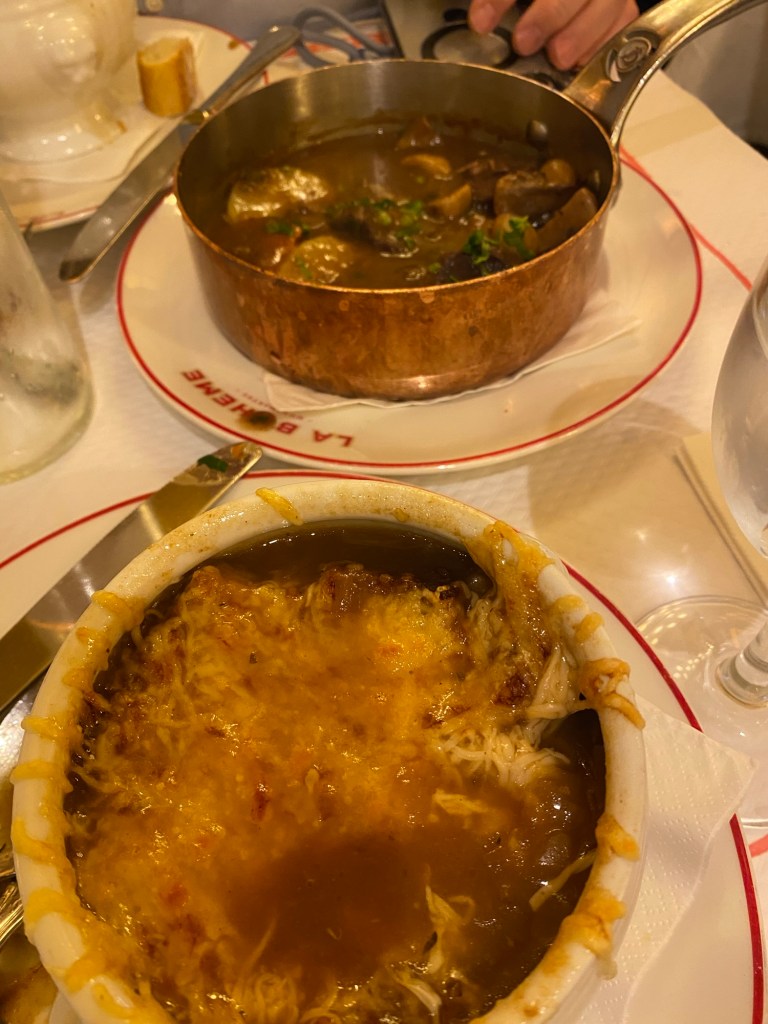 Ile flottantAsparagus Some kind of fish with risotto Rainbow croissant I went to a famous steak place and had fishI am not tired of onion soup yetChampagne! The good stuff